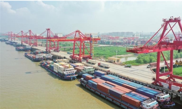 2025年一季度,蕪湖港累計完成集裝箱吞吐量42.93萬標準箱,同比上升13.75%。圖為繁忙的蕪湖港國際集裝箱碼頭作業場景。